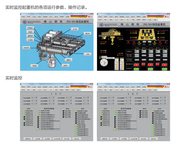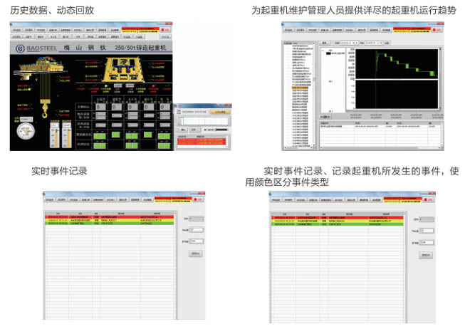 •-1、起重機(jī)狀態(tài)實(shí)時(shí)監(jiān)測:對事故易發(fā)設(shè)備和重點(diǎn)關(guān)鍵設(shè)備的運(yùn)行情況進(jìn)行實(shí)時(shí)監(jiān)測,同時(shí) 對采集的數(shù)據(jù)進(jìn)行分析整理,并把現(xiàn)場的實(shí)際數(shù)據(jù)與相關(guān)的設(shè)備運(yùn)行指標(biāo)進(jìn)行對比,超過偏 差限制時(shí)產(chǎn)生報(bào)警信息并存儲(chǔ)報(bào)警記錄。共享相關(guān)數(shù)據(jù),為及時(shí)發(fā)現(xiàn)和消除設(shè)備故障隱患提 供必要的數(shù)據(jù)支持。